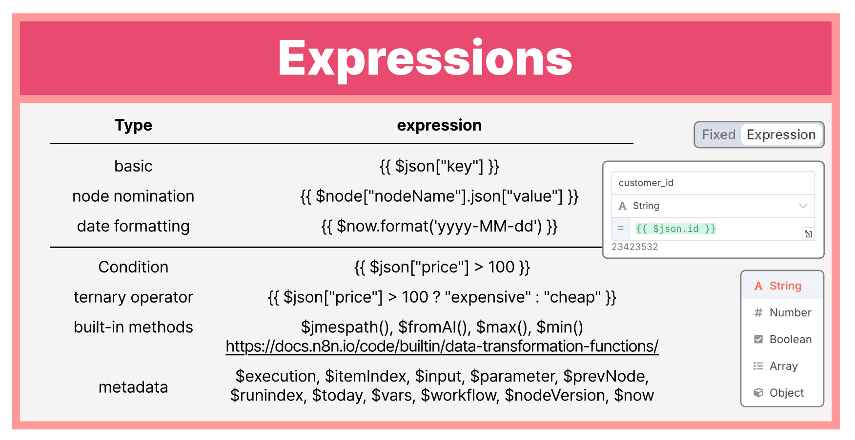 - 조건문 : {{ $json["price"] > 100 ? "expensive" : "cheap" }}