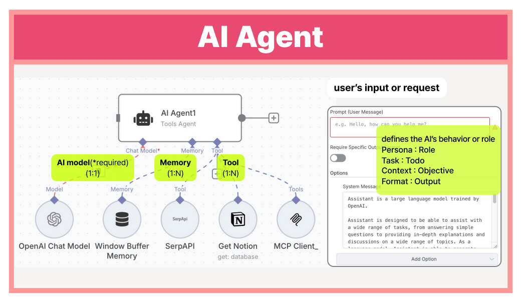 - Memory(1:N), Tool(1:N) 구조 지원 → 예: HTTP Request API 호출, One-click 자동 채움.