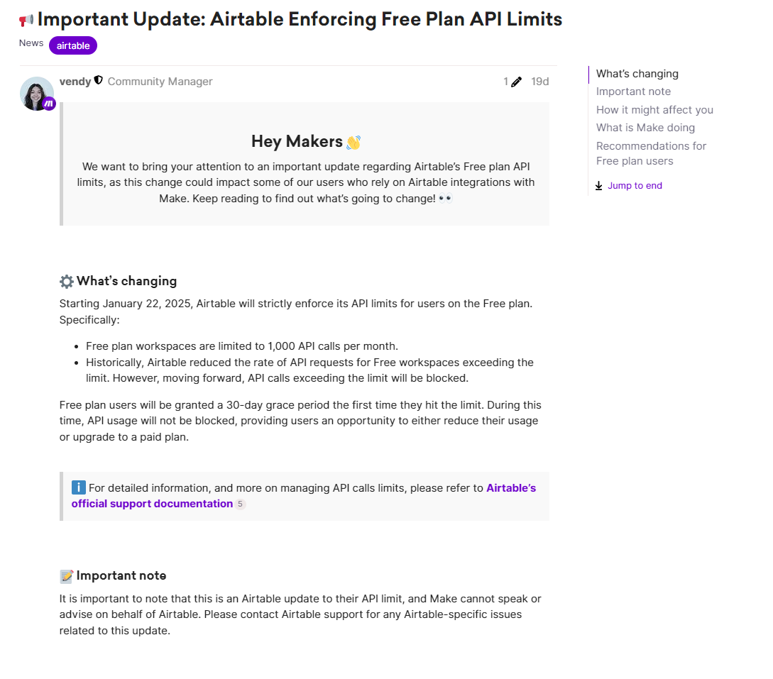 make 사용자 airtable 무료 플랜 API 제한 관련 공지